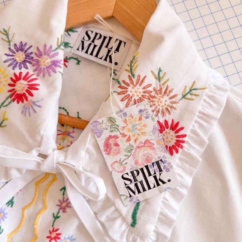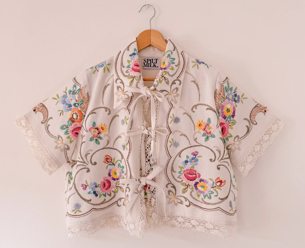 💡 Upcycle goal: Turn embroidered linens into a one-of-a-kind shirt that you’ll treasure forever.