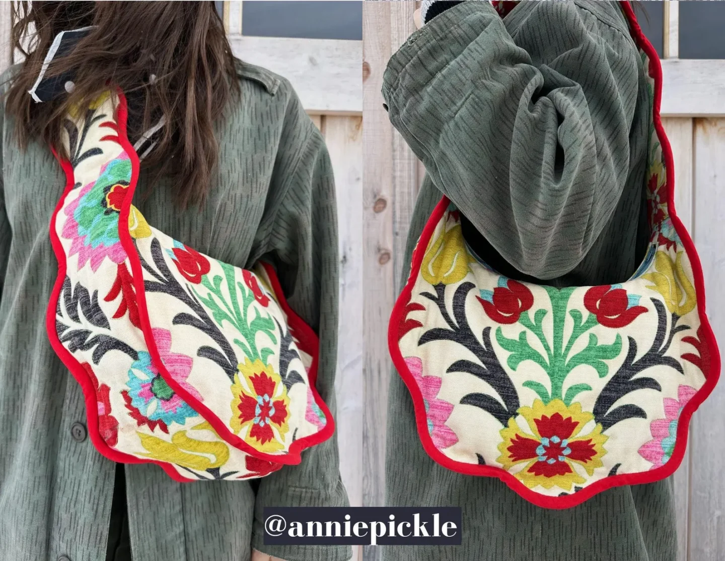 It comes in two sizes and includes a sew-along video tutorial on YouTube, which gives me hope as a beginner bag maker. I’ve never made a bag before, but this one is seriously tempting me to dive in. One version I spotted that I can’t stop thinking about used thrifted fabric with a pop of red – honestly, chef’s kiss.