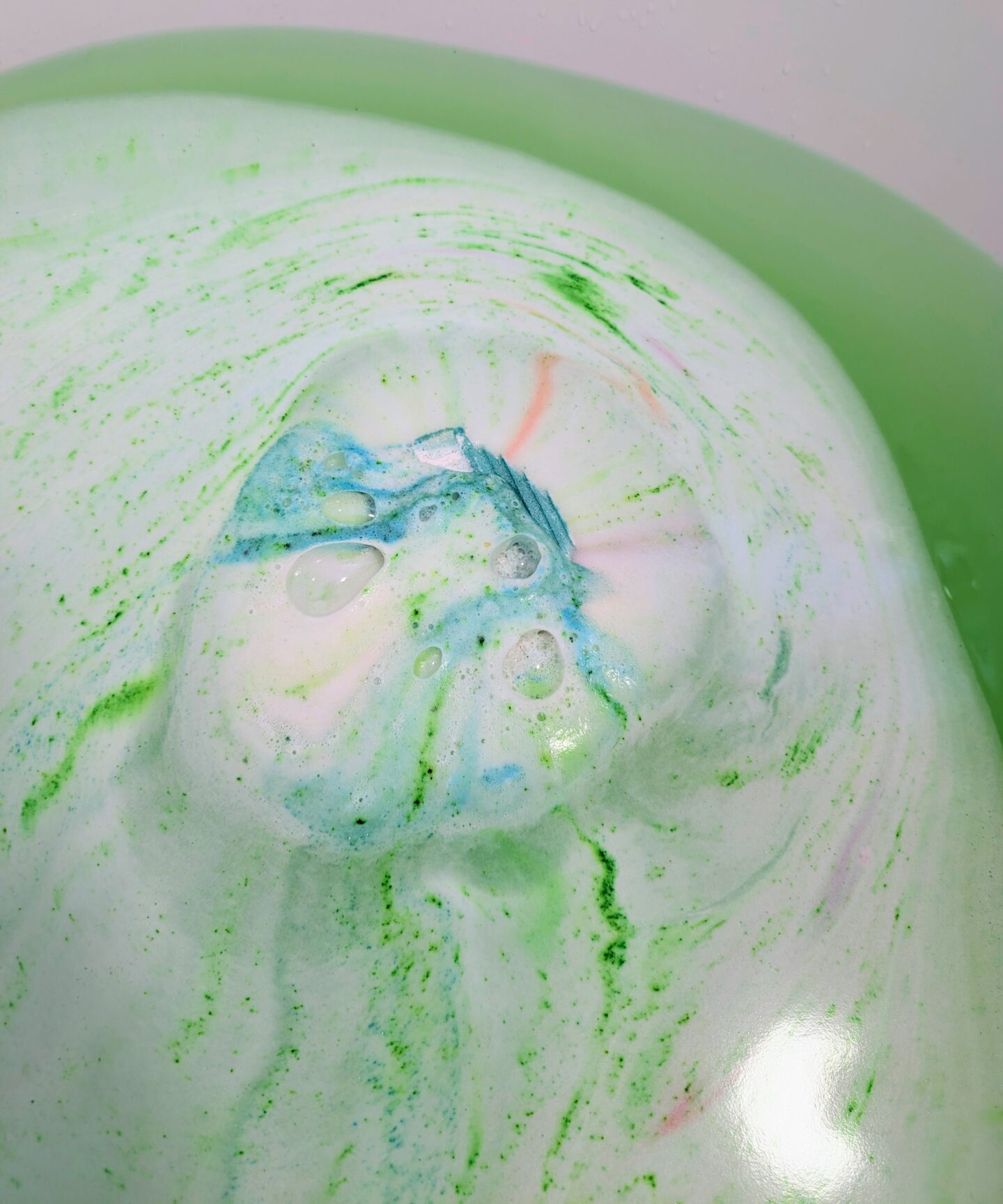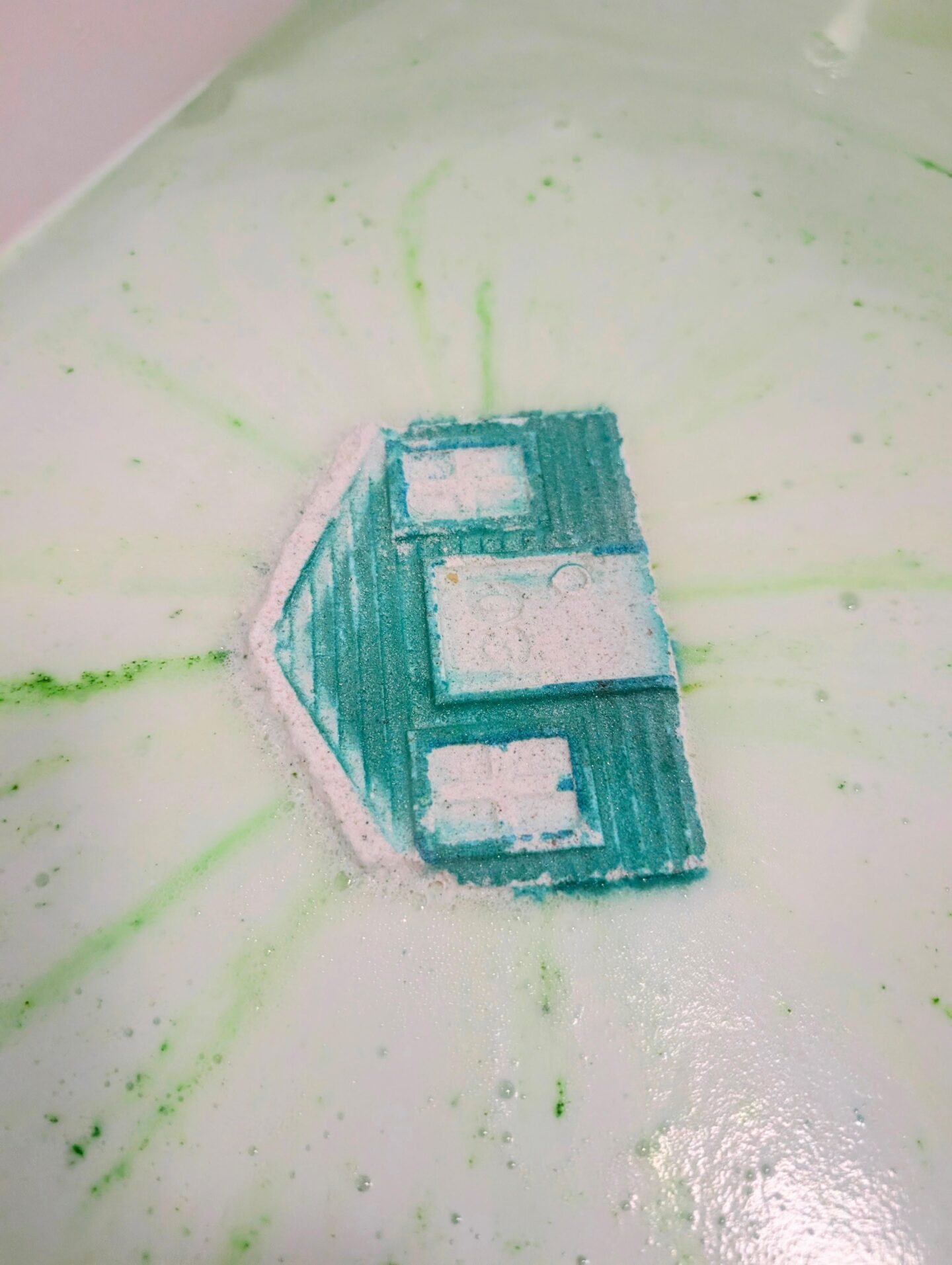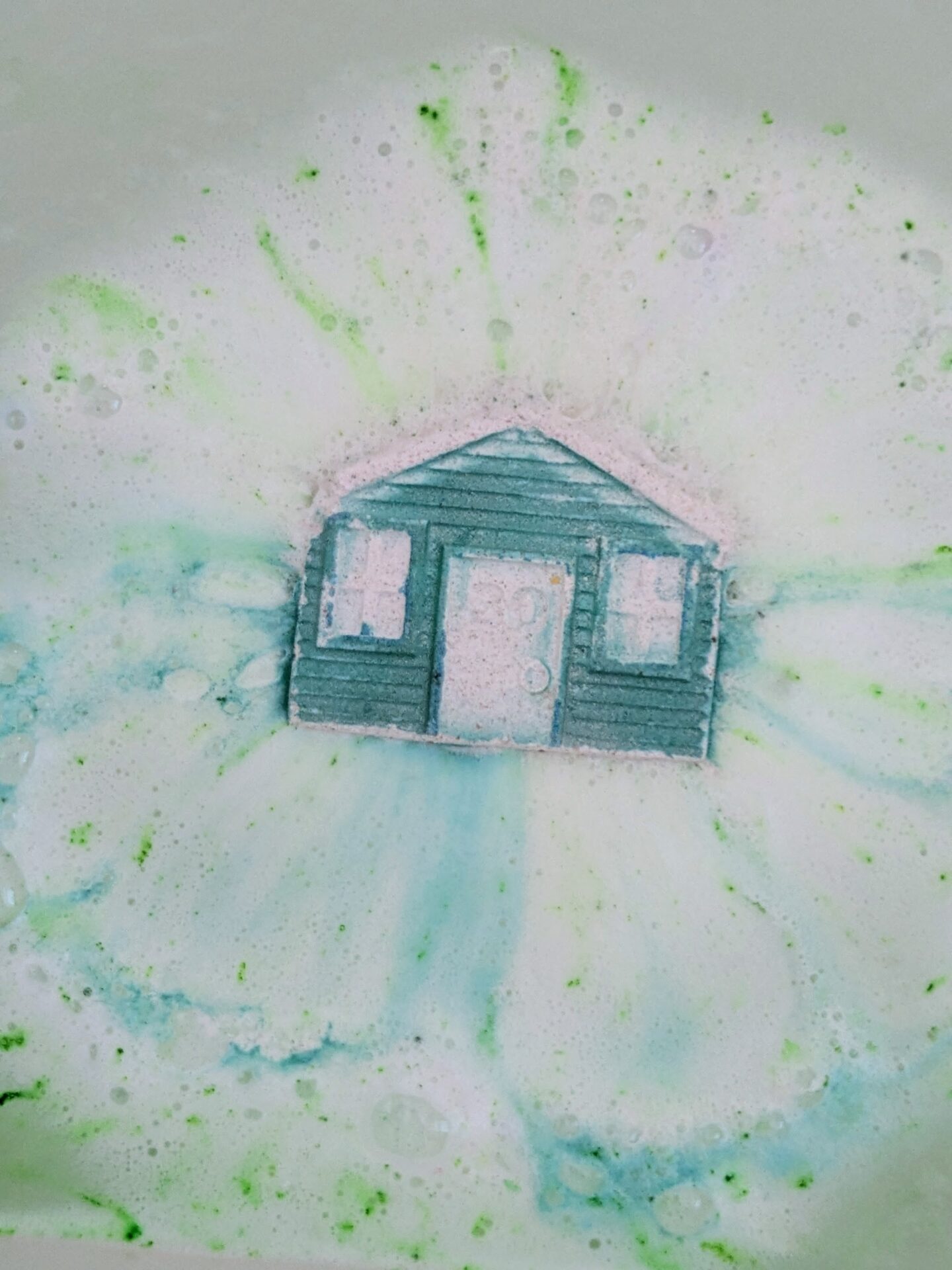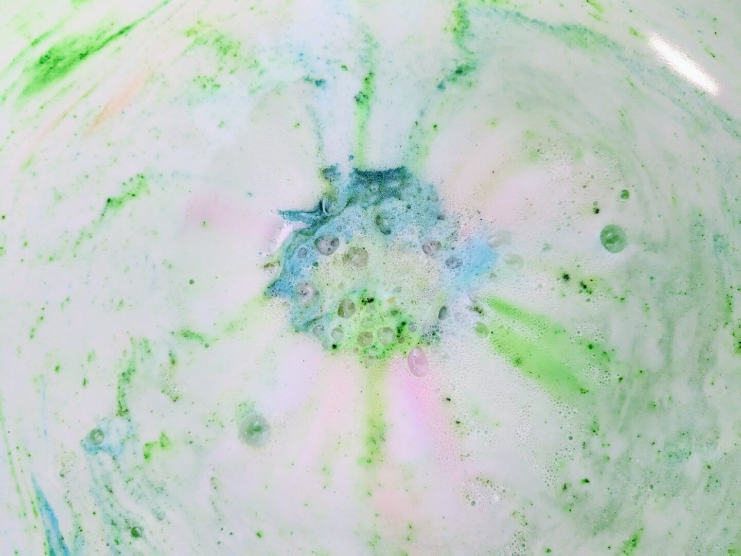 - You float, tired and content, as the bath bomb paints a little green foam art on the water’s surface.