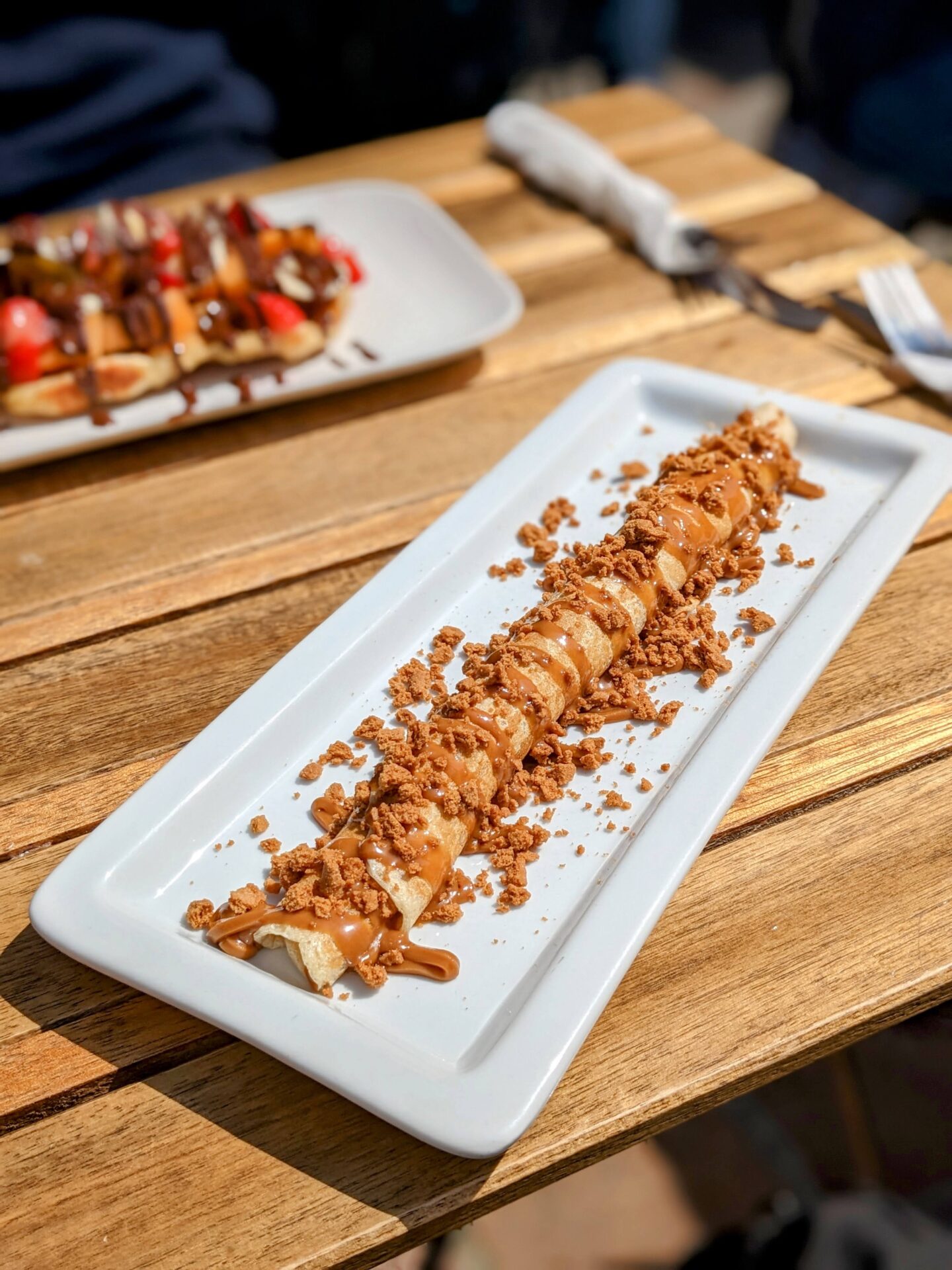 Their vegan crêpe options were a revelation, and we couldn’t resist the Speculoos (Lotus Biscoff) crêpe. The crêpe was perfectly thin and slightly crispy at the edges, with a generous spread of sweet Speculoos. The flavour was a delightful balance of rich caramel creating a comforting and indulgent treat that was hard to beat.