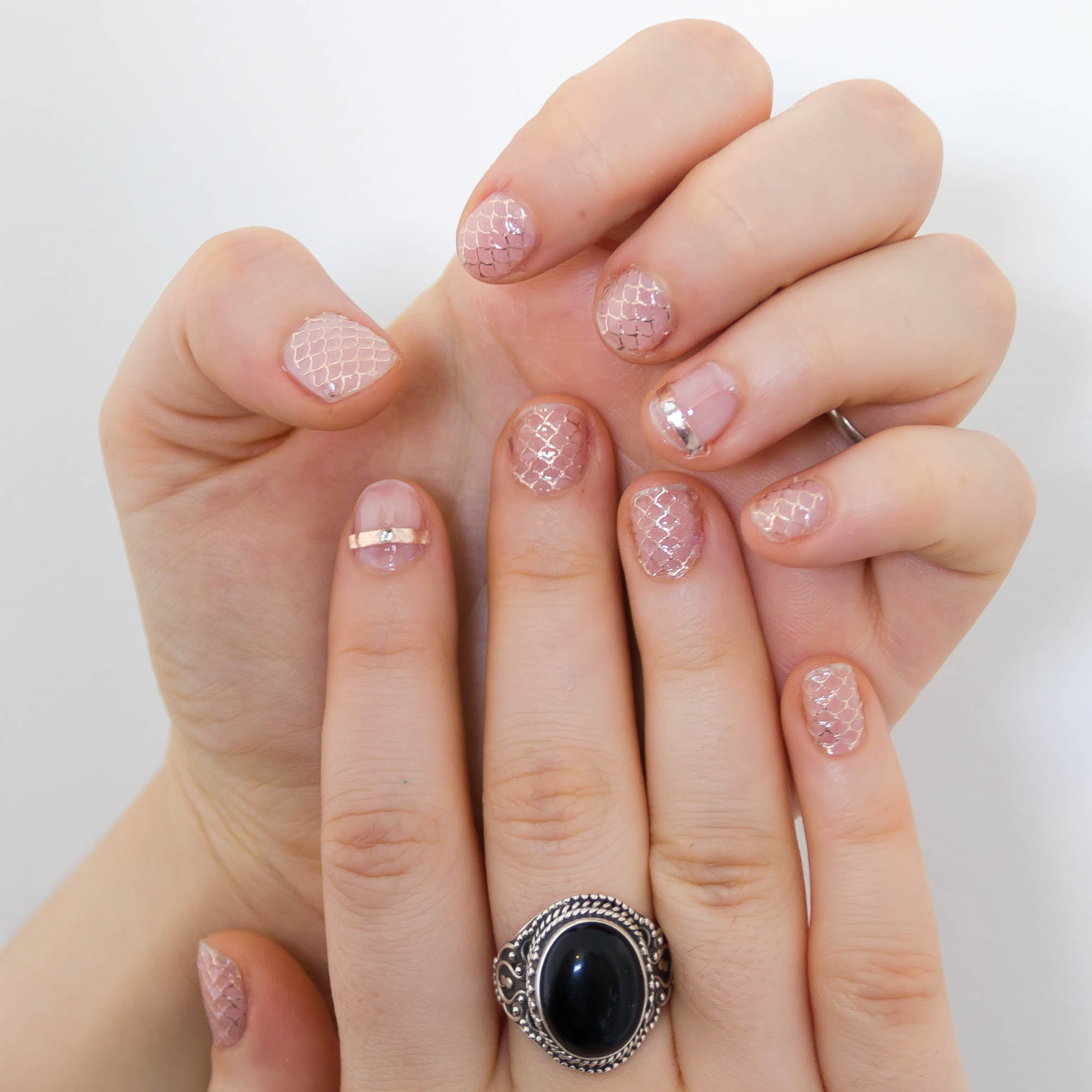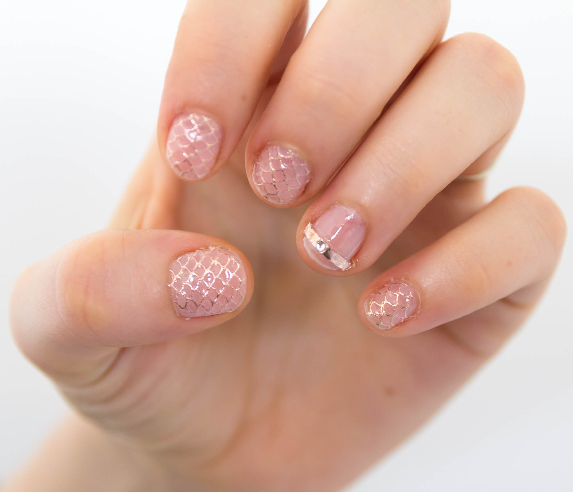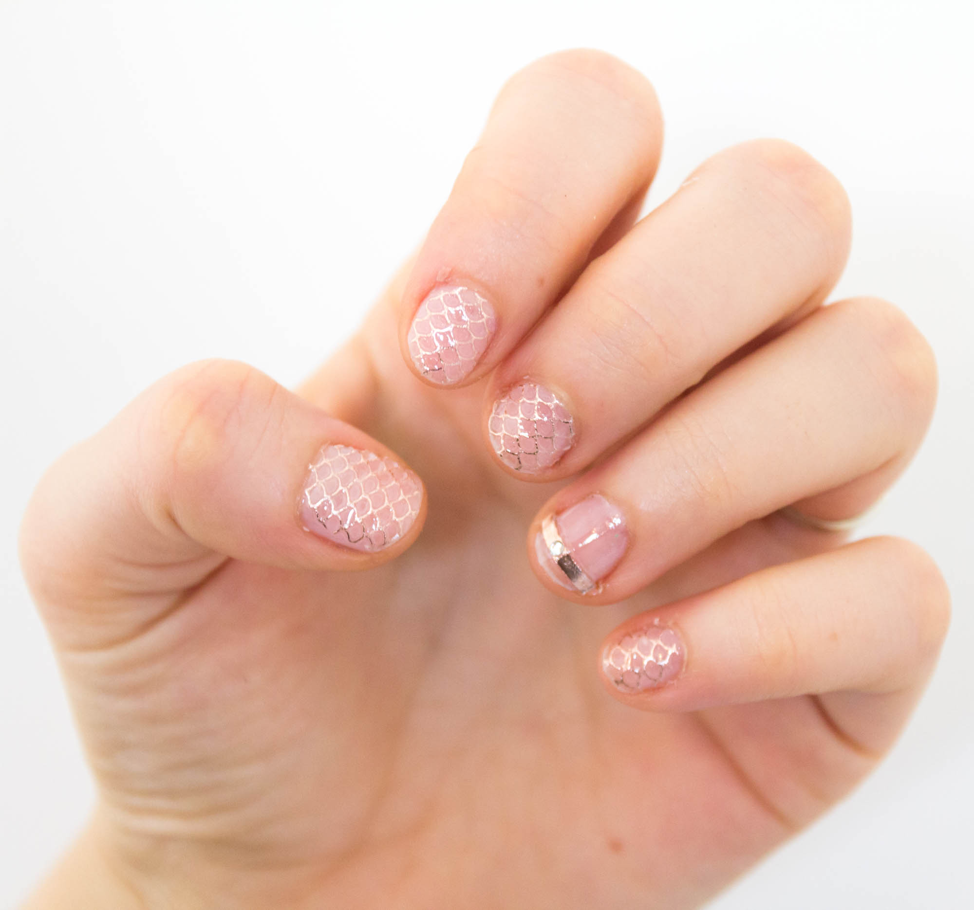 The essence cosmetics jewelry nail stickers are a pretty rose gold tone with a mermaid tail, scalloped design. In the packet are enough for a whole set of 10 nails or you could use it for the odd accent nail. In the UK they are only £1.30 so no guilt if you use them all in one go!