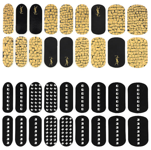 For the nails are the YSL Rebel Metal Fall 2015 Couture Metal Manicure nail stickers, easy to use appliqués with matte black nails, gold sequins and crystal studs. The Couture Metal Manicure nails contain 18 sheets of nail foils as well as a nail file.